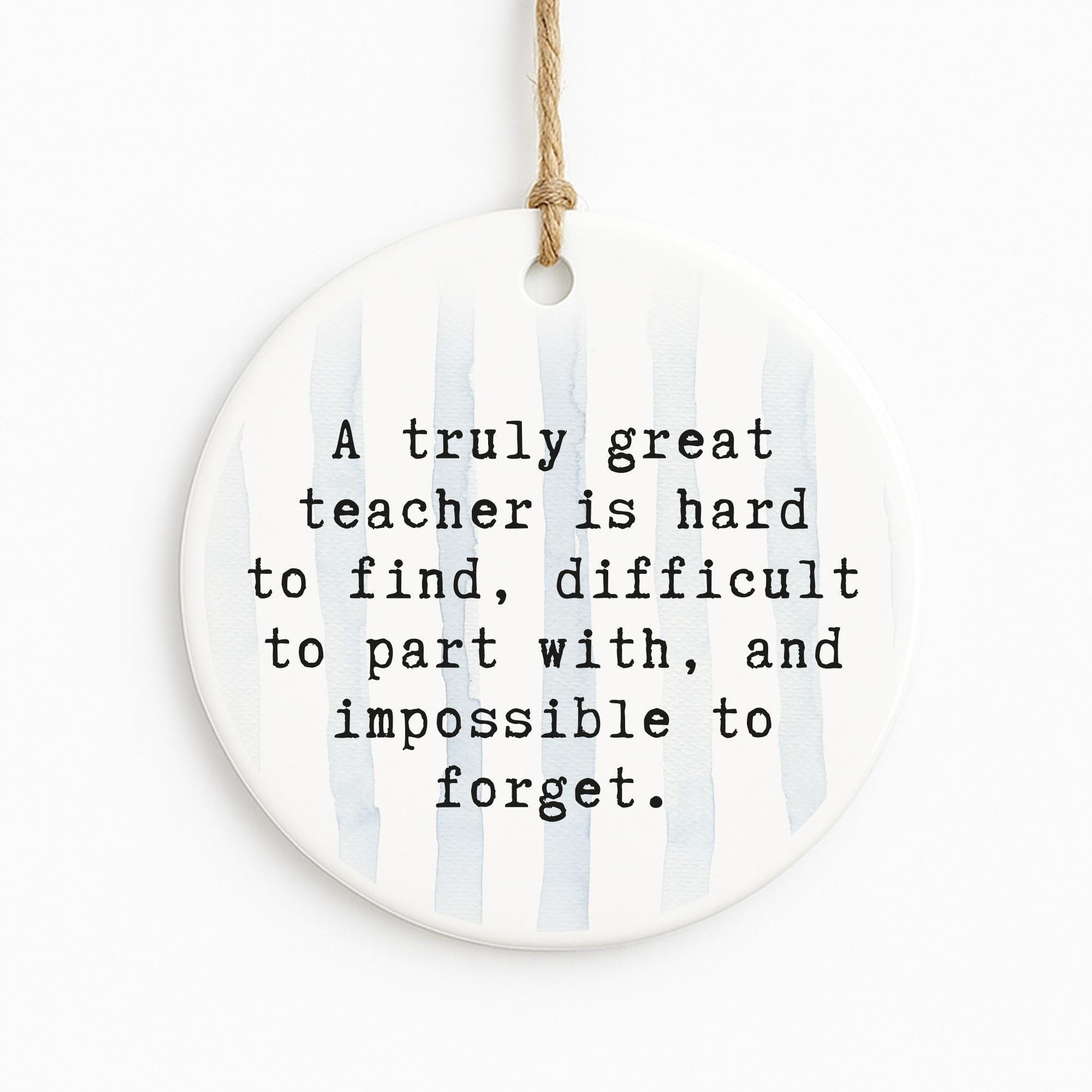 • A timeless teacher keepsake featuring the quote “A truly great teacher is hard to find, difficult to part with, and impossible to forget” on a soft striped background.