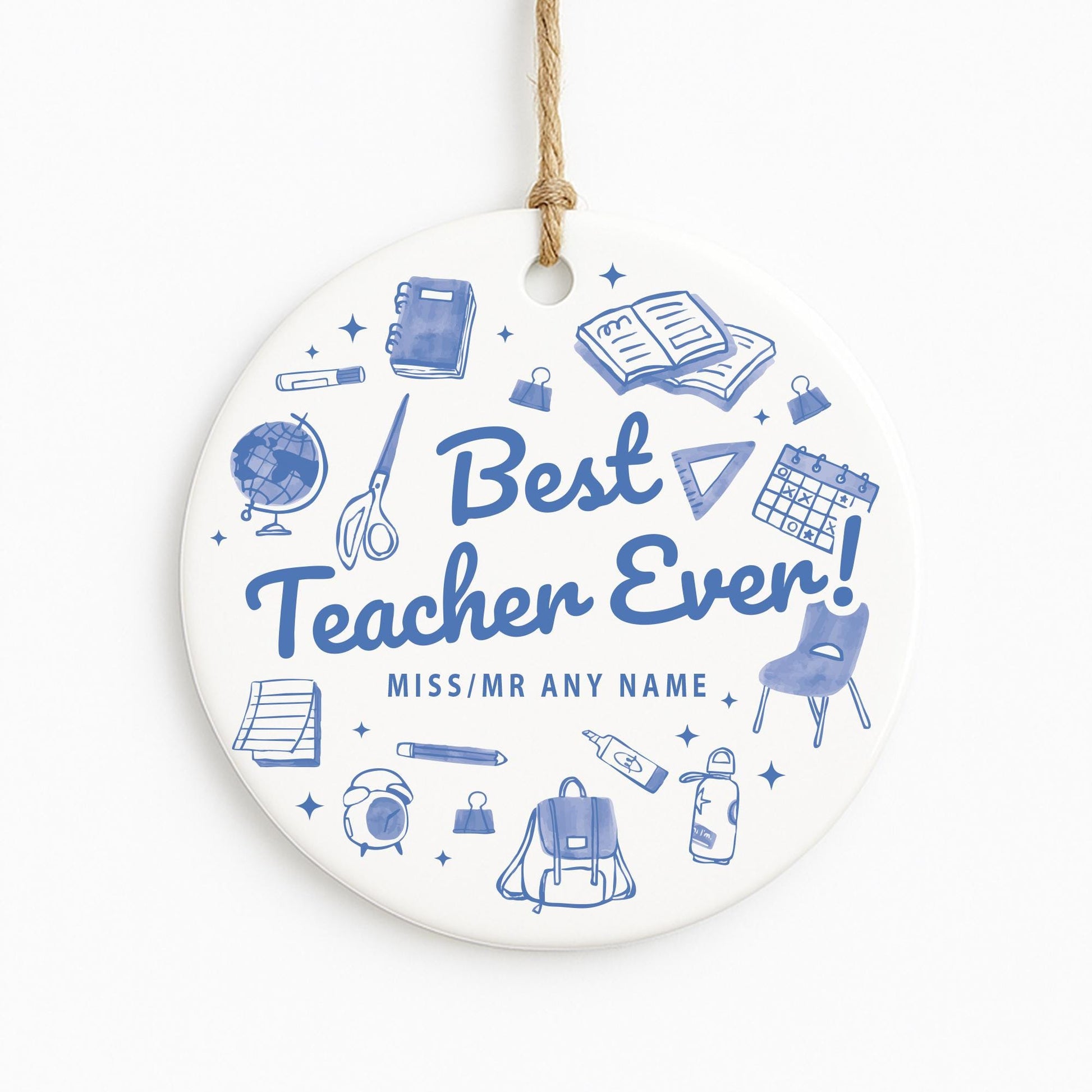 This personalised “Best Teacher Ever” ornament features a charming hand-drawn blue doodle design, filled with classic school icons – books, globes, pens, backpacks and stars. Printed on a premium round ornament, it makes a heartfelt thank-you gift for teachers, TAs, nursery staff and tutors.