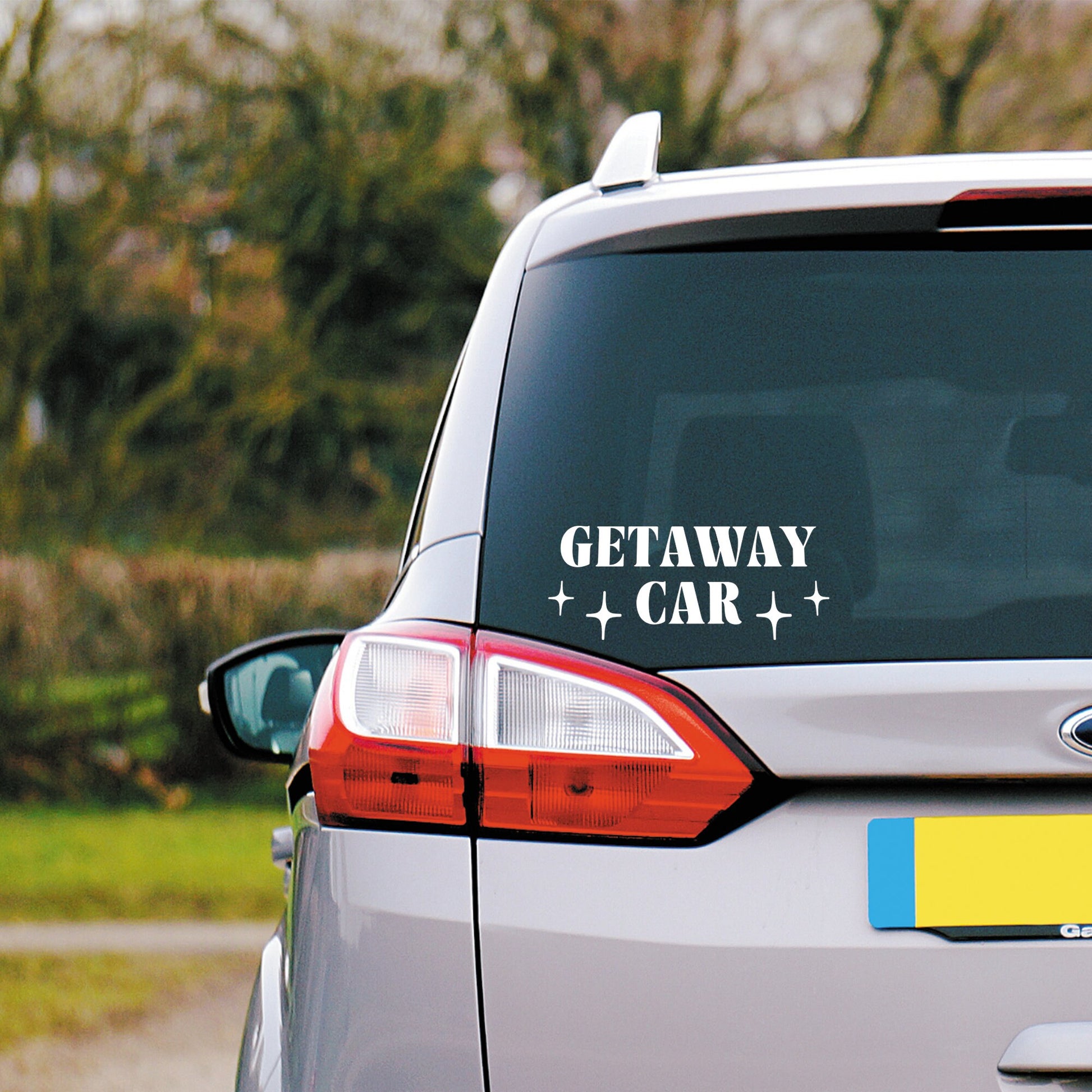 Elevate your car‘s appearance with a high-quality vinyl sticker featuring a "Getaway Car" theme. Designed for exterior car windows but versatile for other clean, smooth surfaces. If you prefer the design inside the window, just message us for a flipped design. Our stickers come with clear transfer tape for easy application.