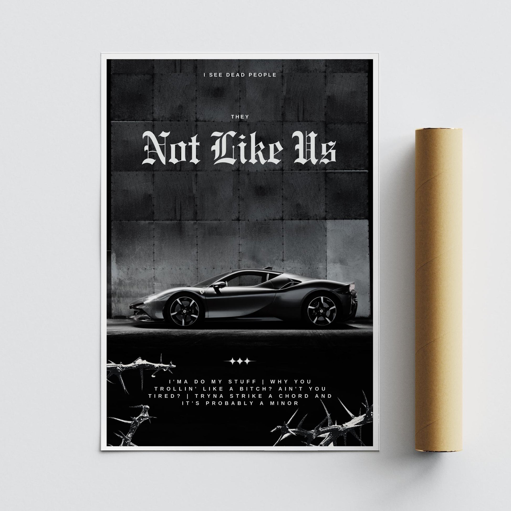 Channel the raw energy and unapologetic attitude of "They Not Like Us" with this striking poster design. Perfect for fans of bold music, luxury cars, and gritty aesthetics, this wall art features powerful lyrics that capture the rebellious and artistic spirit of the song. Set against a dark industrial background, the sleek sports car that features in the music video, complements the edgy design.
