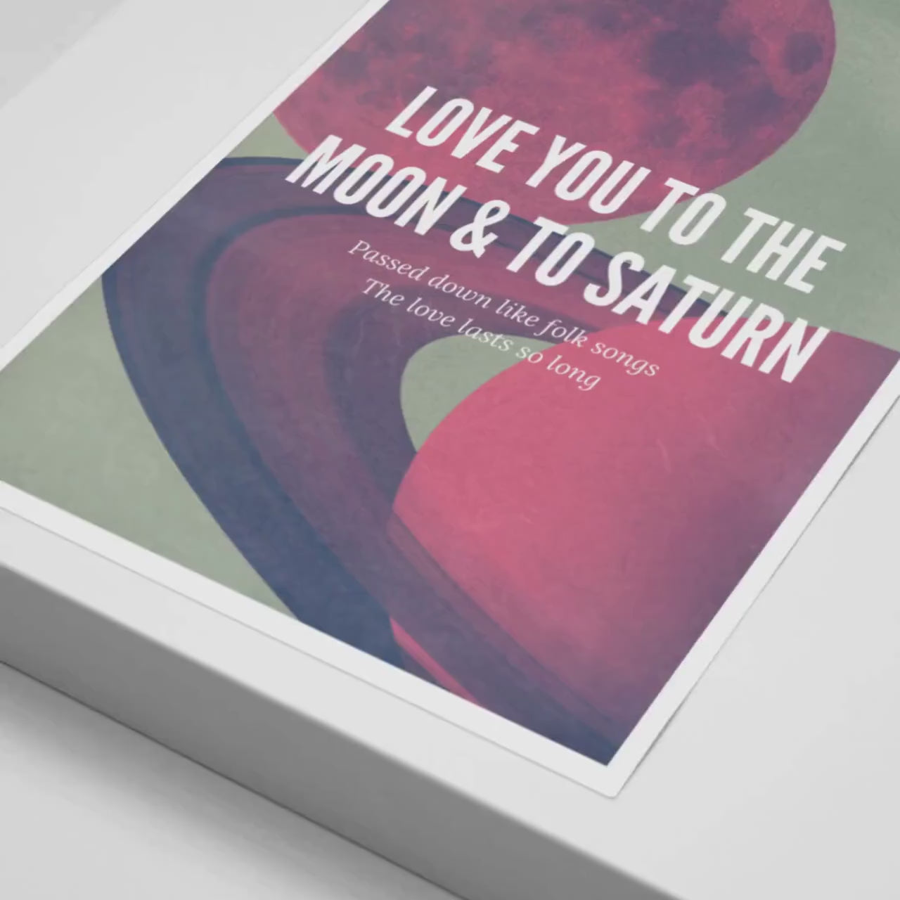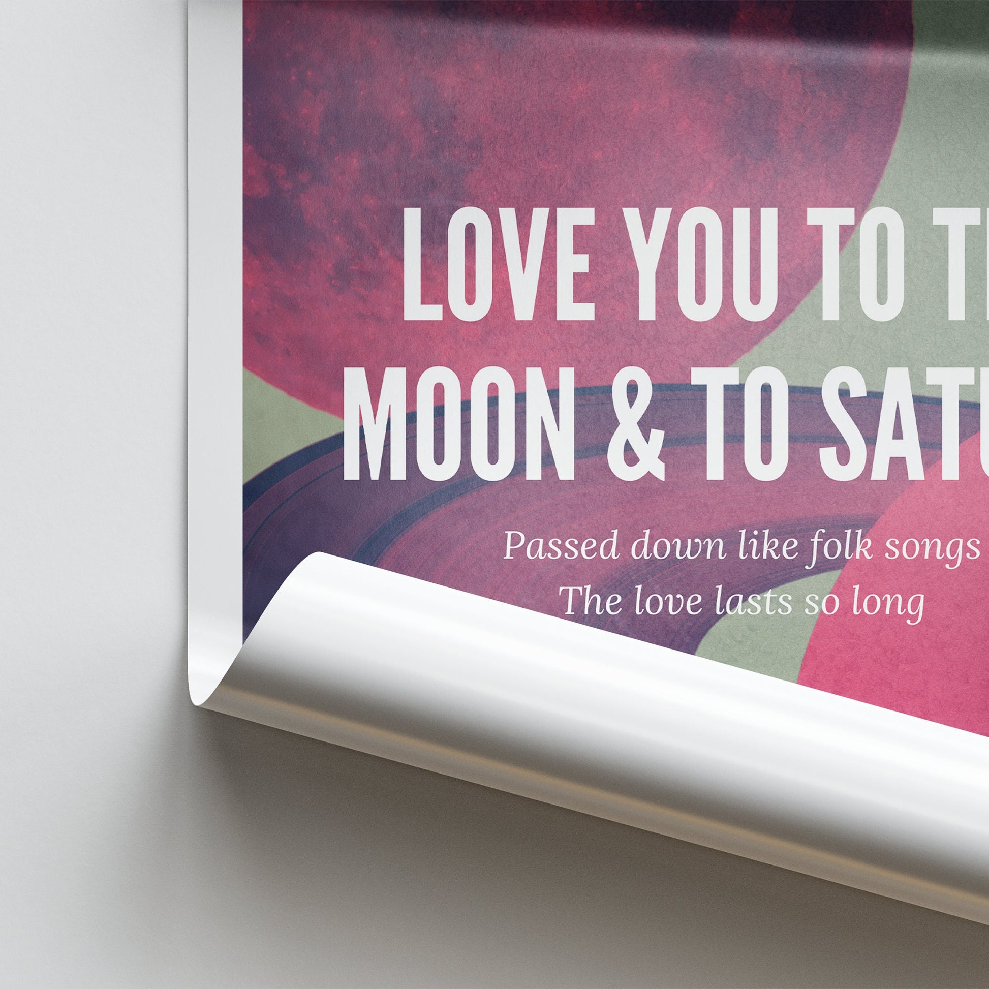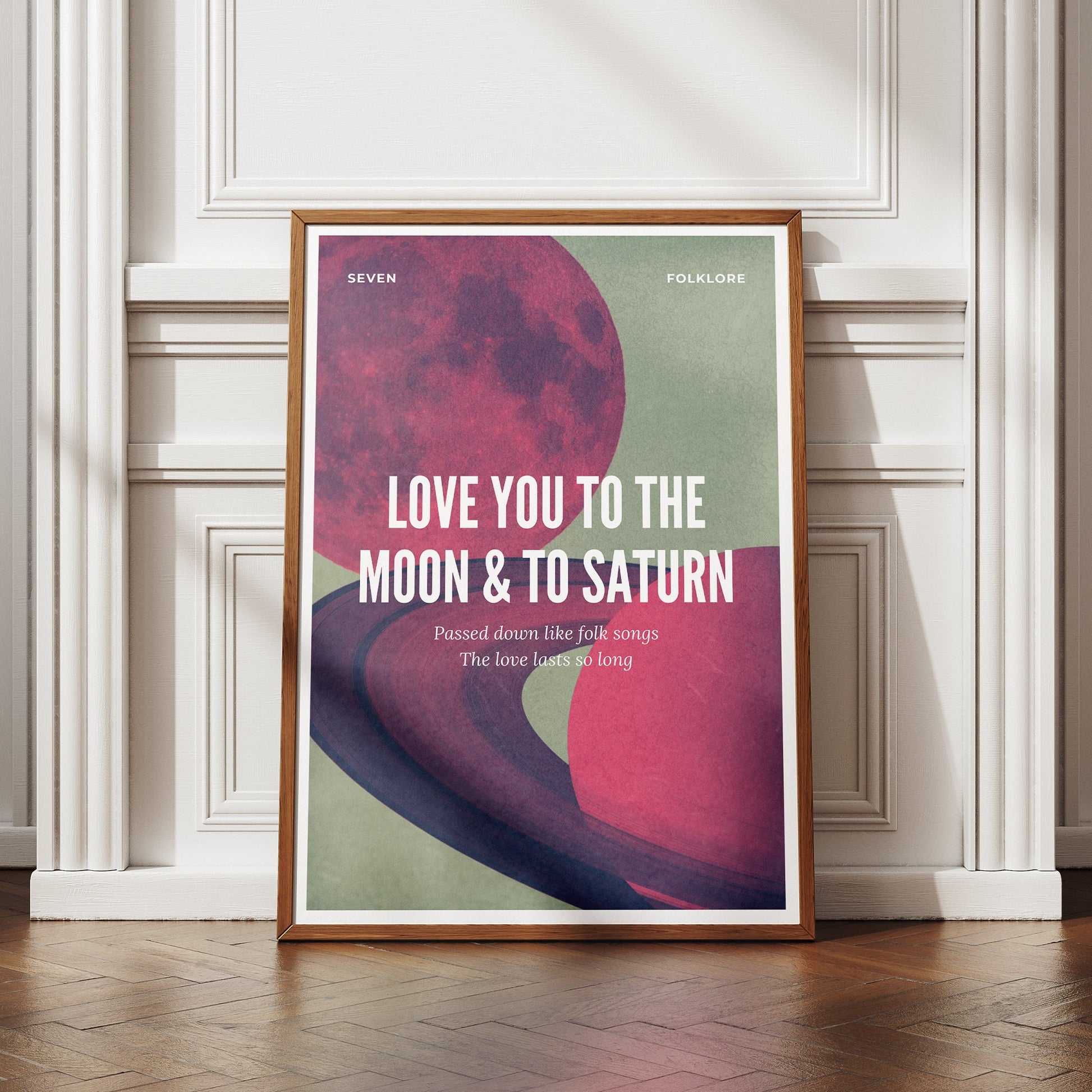 Celebrate your love with our stunning "Love You to the Moon and Saturn" poster, inspired by the heartfelt lyrics of Taylor Swift. This beautiful art print features a sleek typographic design, making it a perfect addition to any home decor.