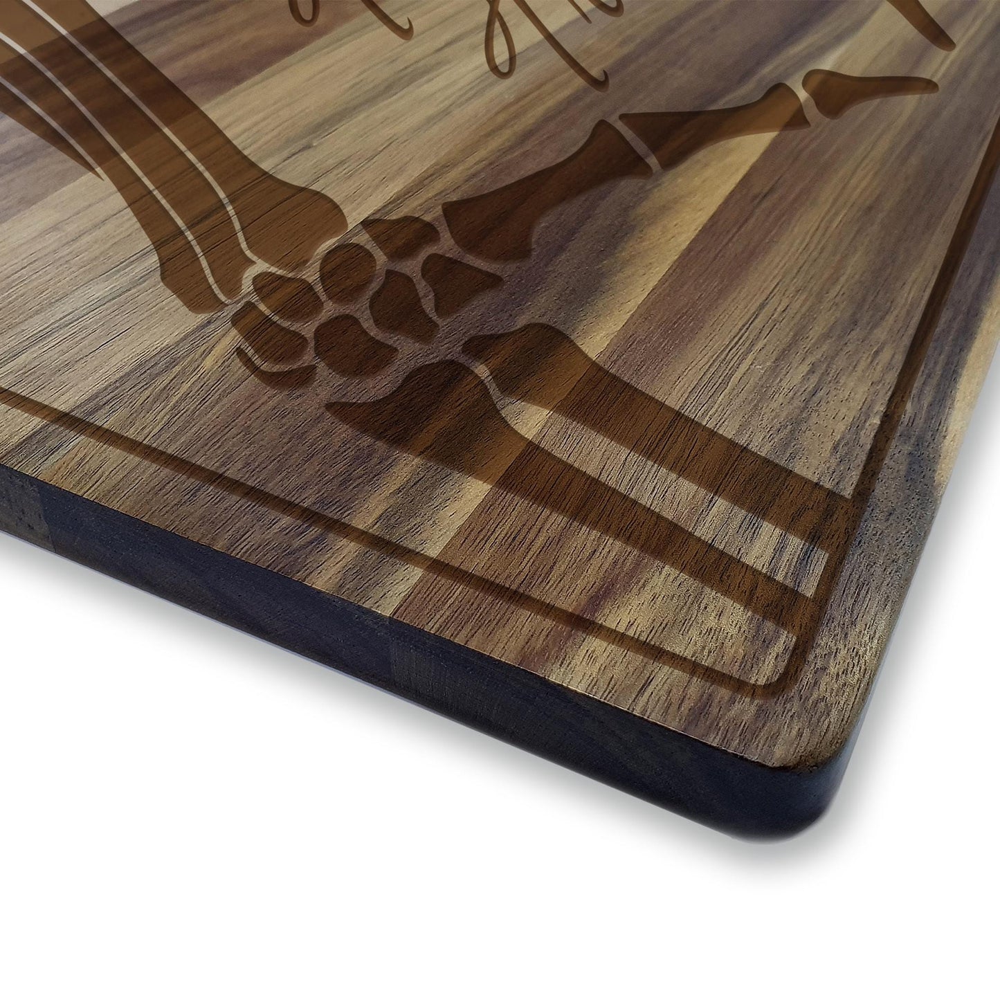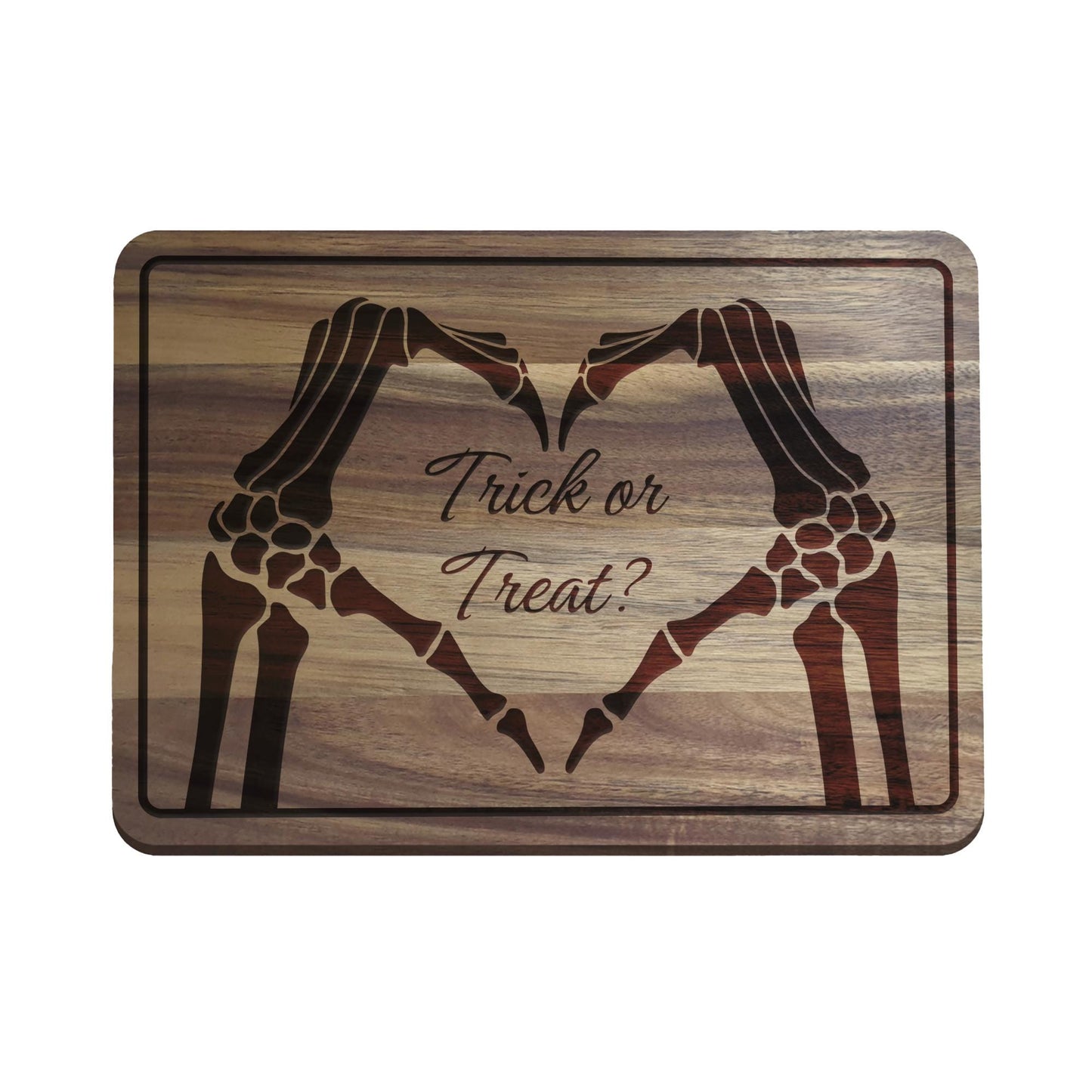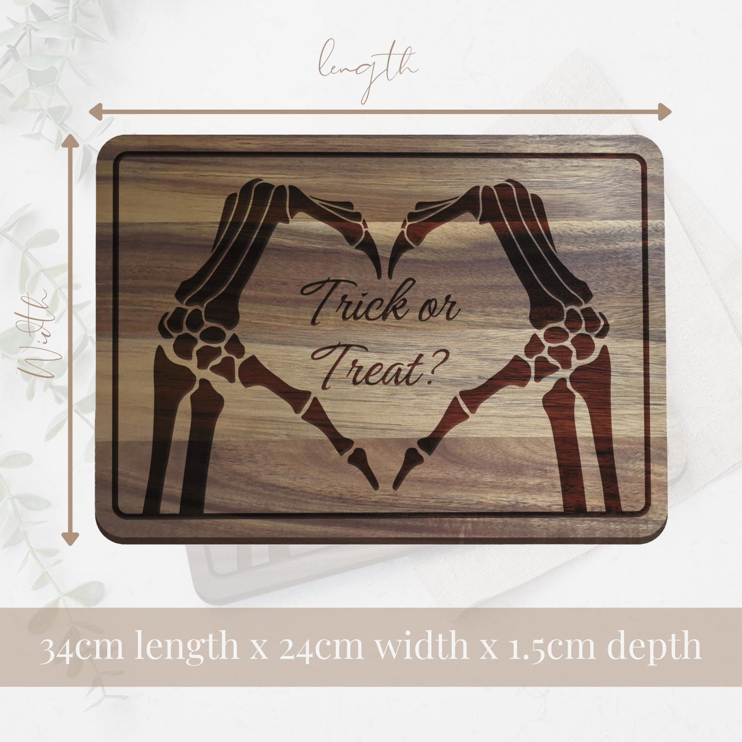 Add a touch of spooky charm to your kitchen with our "Trick or Treat" Acacia wood chopping board! Perfect for Halloween lovers, this beautifully engraved board combines functionality with festive flair. Made from premium Acacia wood, known for its durability and striking grain patterns, this cutting board is ideal for everyday use or as a statement piece in your seasonal kitchen decor.