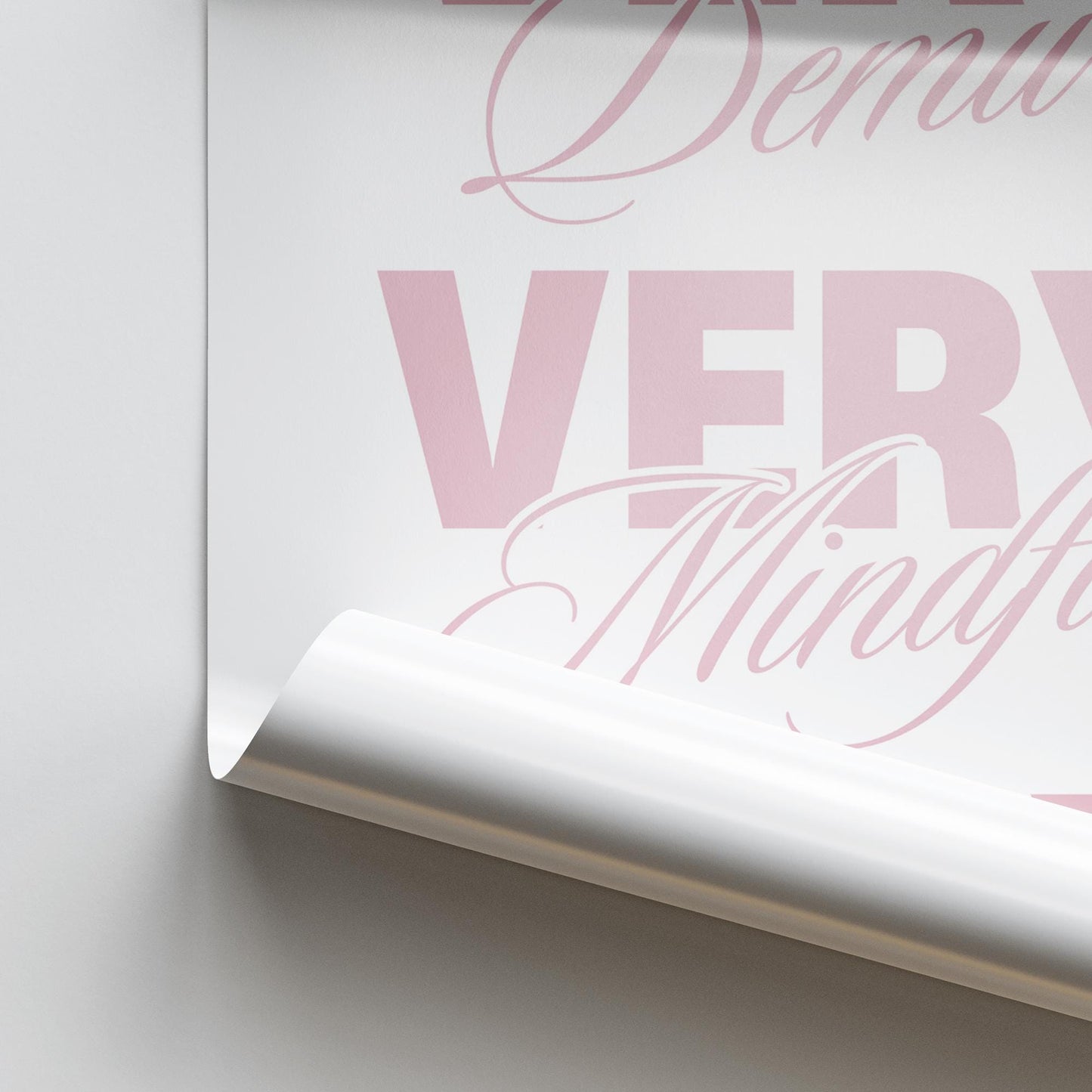 Add a touch of charm and mindfulness to your space with this beautifully designed wall art poster featuring the uplifting phrase "Very Demure, Very Mindful, Very Cutesy." Perfect for those who appreciate elegance with a playful twist, this poster blends gentle aesthetics with a meaningful message. Ideal for home offices, bedrooms, or cosy nooks, it serves as a daily reminder to stay poised, thoughtful, and endearing. Printed on high-quality, durable paper, this poster is ready to inspire and brighten any room. Perfect gift for loved ones who cherish positivity and style in their decor.
