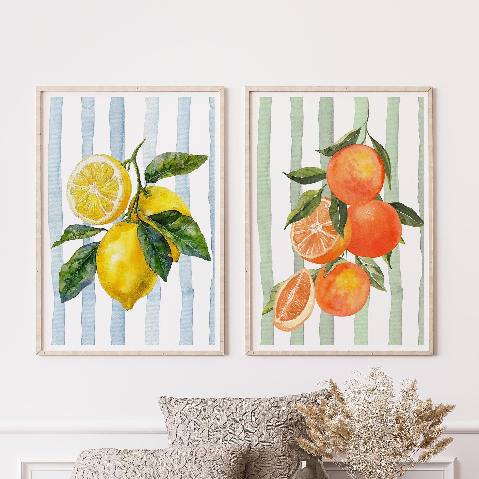 Watercolour Lemon Print | Italian Fruit Wall Art with Blue Stripes, Mediterranean Kitchen Decor, Coastal Botanical Poster, Summer Aesthetic