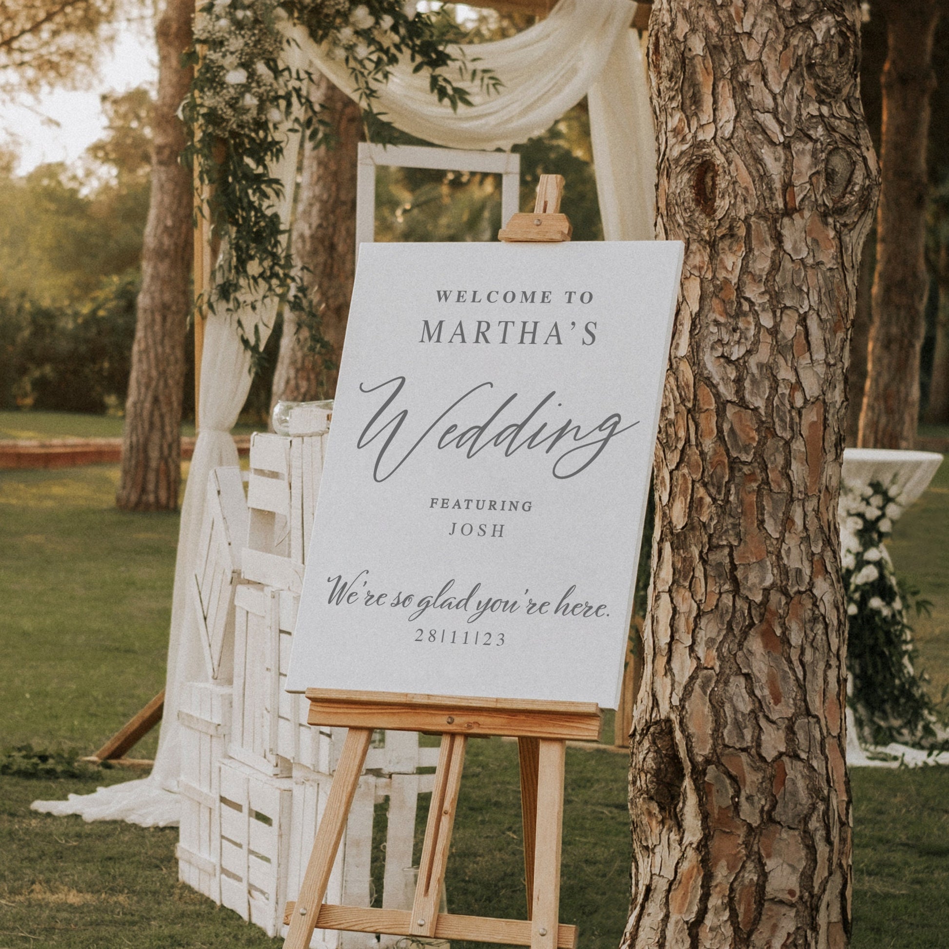 Set the tone for your wedding and greet your guests with this funny witty welcome sign. This humorous sign is easy to personalise with your names and wedding date. The name order is up to you! As we offer 4 different sizes, this sticker looks great on any smooth display board/surface!
