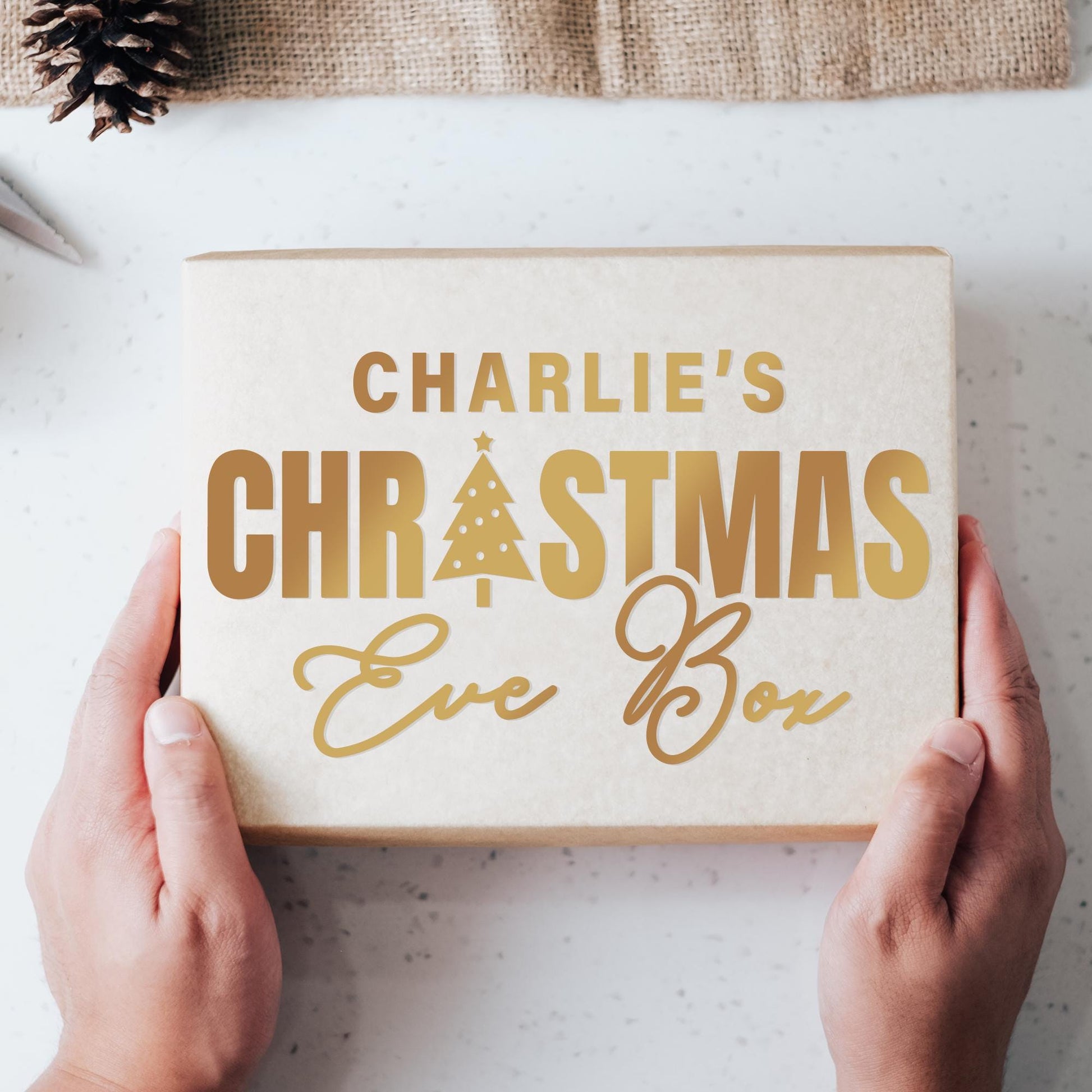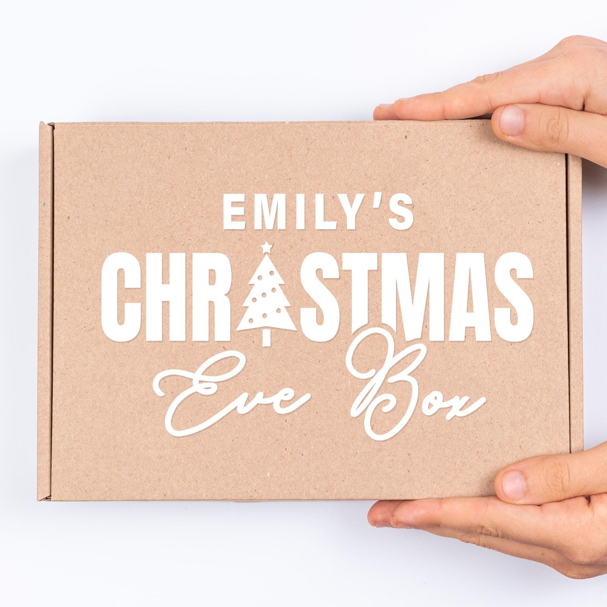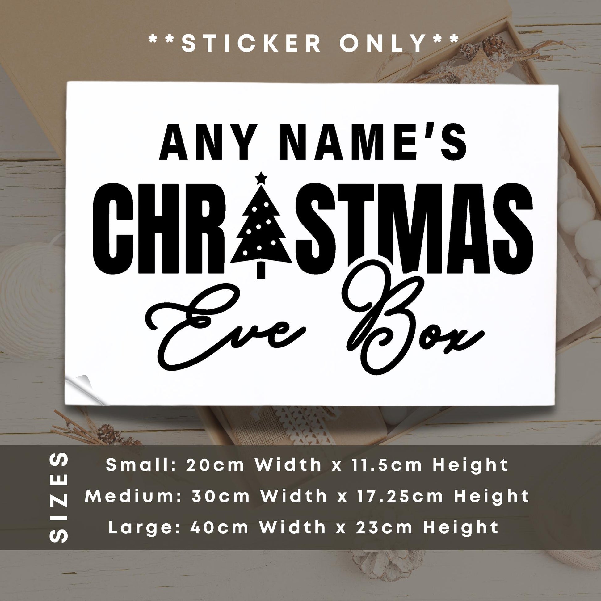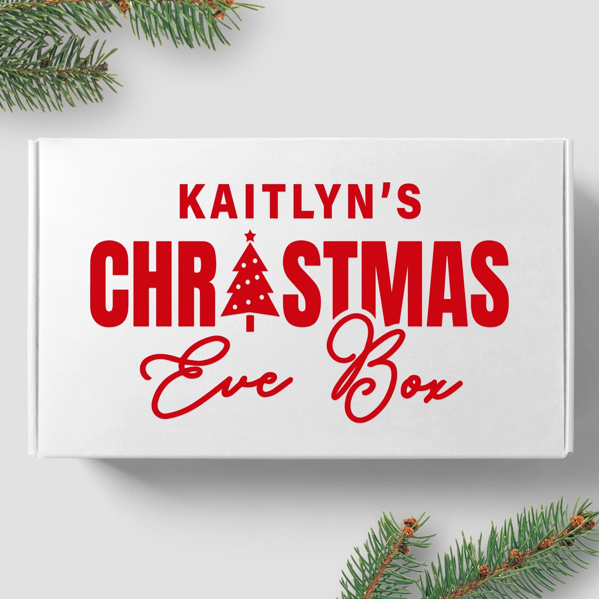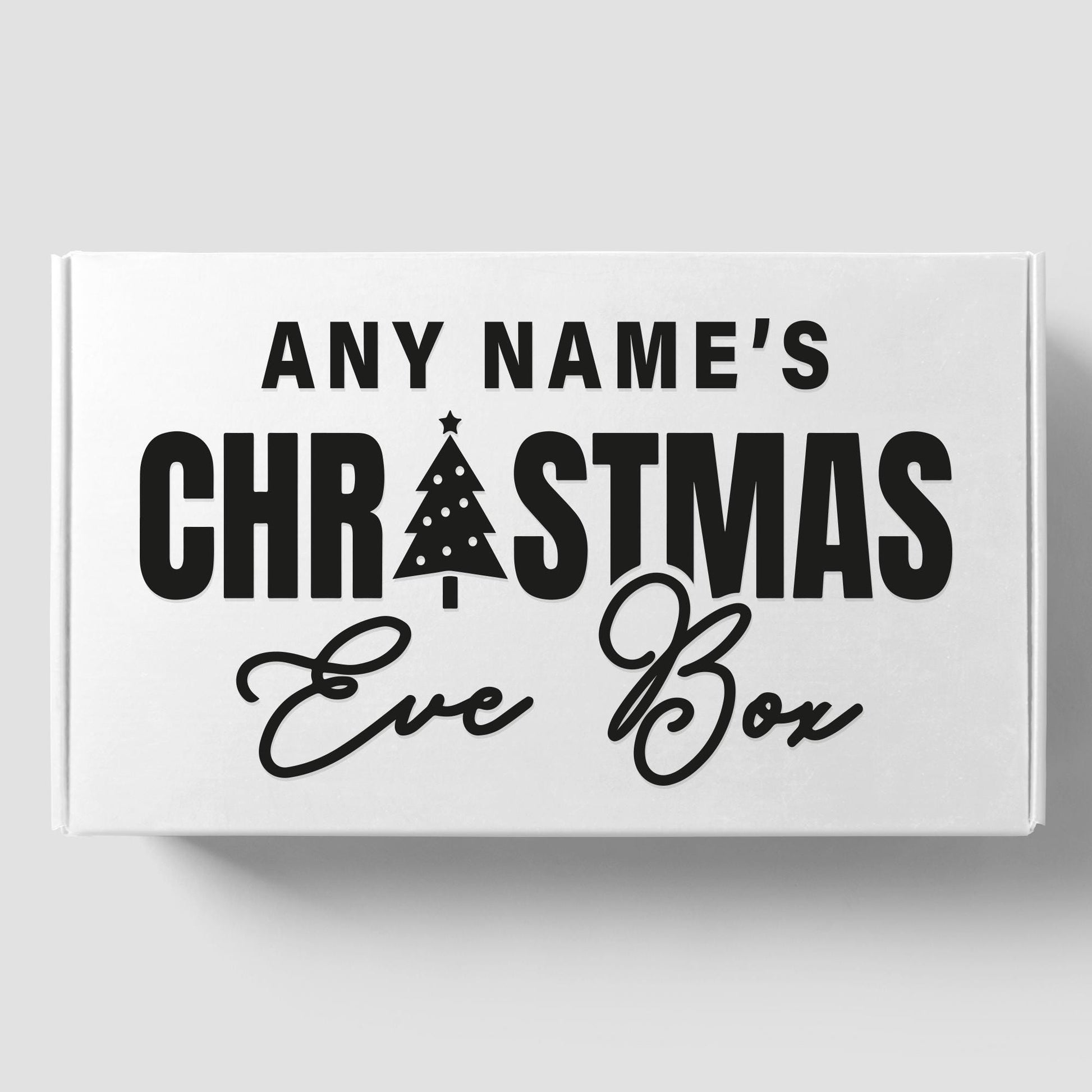 Xmas Eve Box - Bold Text & Tree: Personalised Christmas Eve Box Sticker, Custom Name Gift Box Decal, Christmas Eve Gift Idea, Gift Box Label
